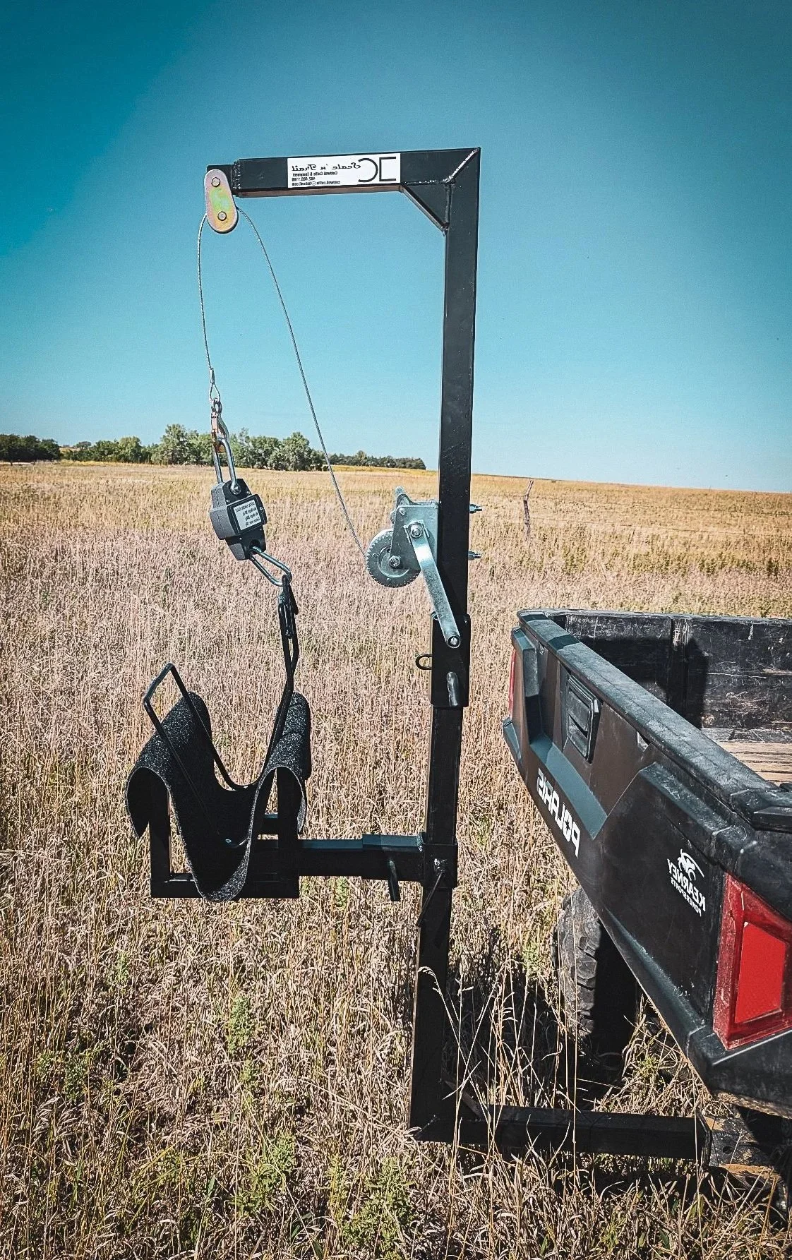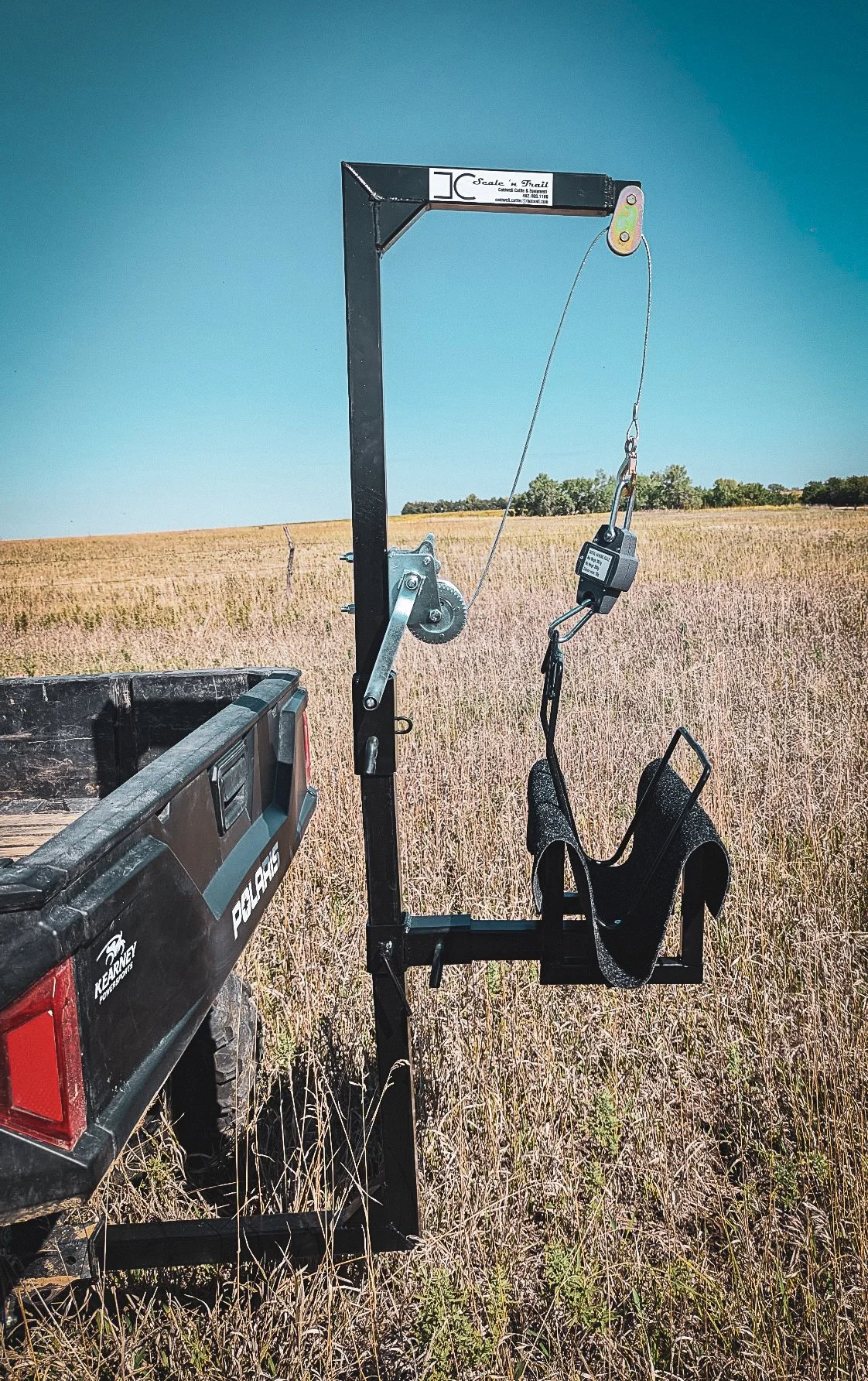 Includes your custom Scale ’n’ Trail system with frame, sling, scale, cradle, and a 12-volt electric winch.